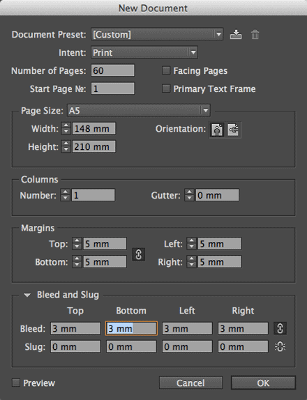 Add '3mm' in the top, bottom, left and right boxes here to add a border on your InDesign artwork 3mm outside the page edge to guide you where the bleed needs to extend to. For further information on bleed see the Bleed set up section.